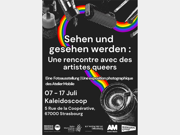 Werfen Sie vom 7. bis 17. Juli einen Blick auf die Fotoausstellung „Sehen und gesehen werden: Une rencontre avec des artistes queers“ im Kaleidoscoop in Straßburg. Dieses künstlerische Projekt wurde von unserem deutsch-französischen Freiwilligen, Olivier SIMON, im Rahmen seines Freiwilligendienstes beim Atelier Mobile der Kunstschule Offenburg realisiert.