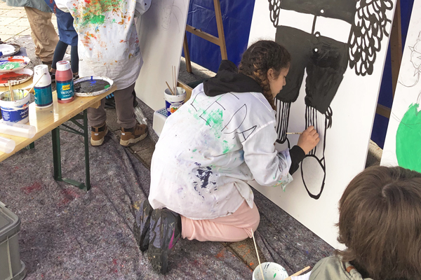 Dank Stadtmarketing Kehl hat das Atelier Mobile zum ersten Mal im öffentlichen Raum auf dem Kehler Marktplatz Halt gemacht. Mit Hilfe unserer Dozentin Maria Cristina Tangorra haben Kinder von beiden Seiten des Rheins trotz des Regens Spaß am Malen gehabt.