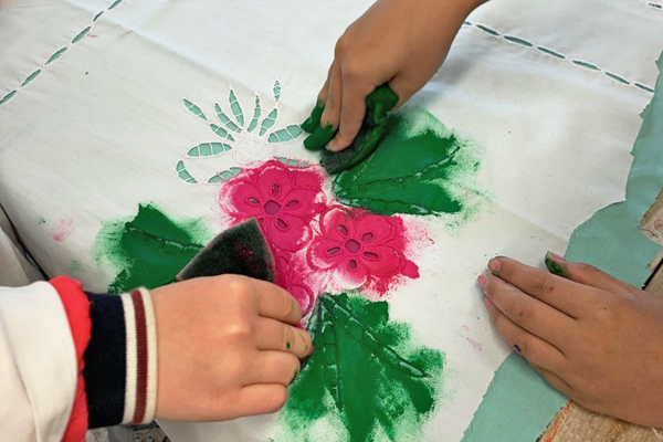 Dank des Programms Rückenwind konnte das Atelier Mobile an der Projektwoche der Grundschule Goldscheuer teilnehmen. Mit der Dozentin Cosima Tribukeit haben die Kinder Naturmotive auf Fahnen gedruckt.